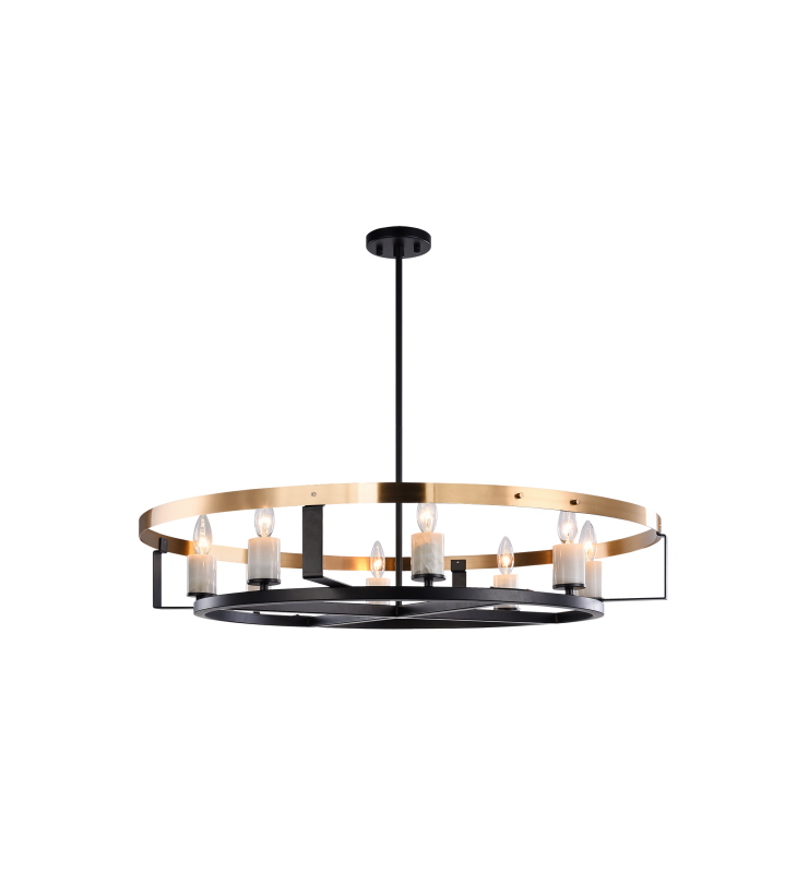 A distinct marble candle-like inspired collection highlighted by an Aged Gold Brass ring with a contrasting Black frame.The Crandle adds elegance and charm to any interior. Available in chandeliers and wall sconces.