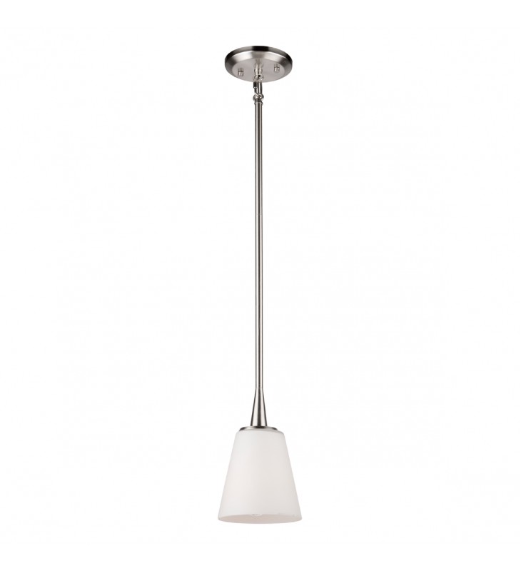 Plated in a rich brushed nickel finish, complimented by frosted white glassware, the single pendant from the \"Clayton\" collection is clean and precise. I nice addition to any bar or island area. Comes with hang straight for sloped ceilings and extra rods for easy height adjustment.\n \n \n \n
