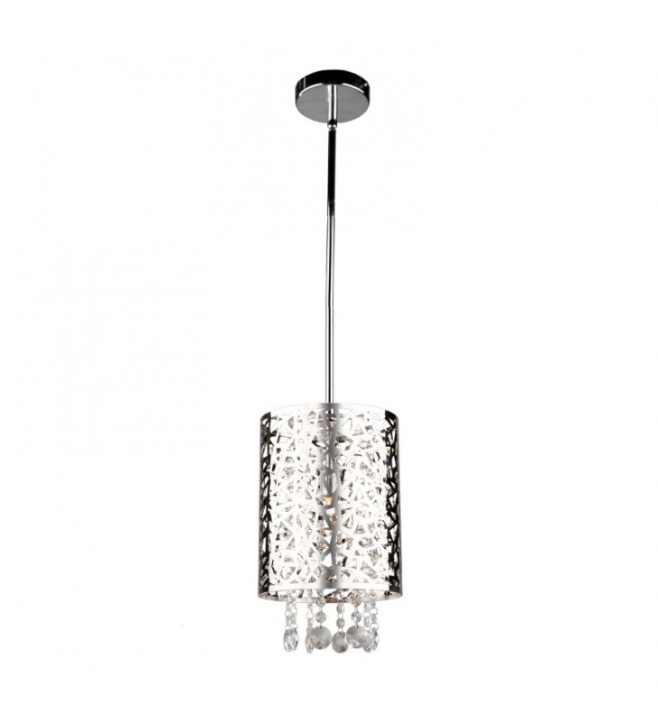 Sparkling crystal jewels complimented with a chrome plated metal shade, the \"Celestial\" collection is fun and exciting. The metal shade has a multiple shape cut design. This chandelier is illuminated with bright G9 halogen bulbs to enhance its sparkle. (Comes with extra rods for height adjustment and hangstraight for sloped ceilings).\nDue to the California Title 20 regulations, replaceable light bulbs will not be included with any product sold to customers in California.