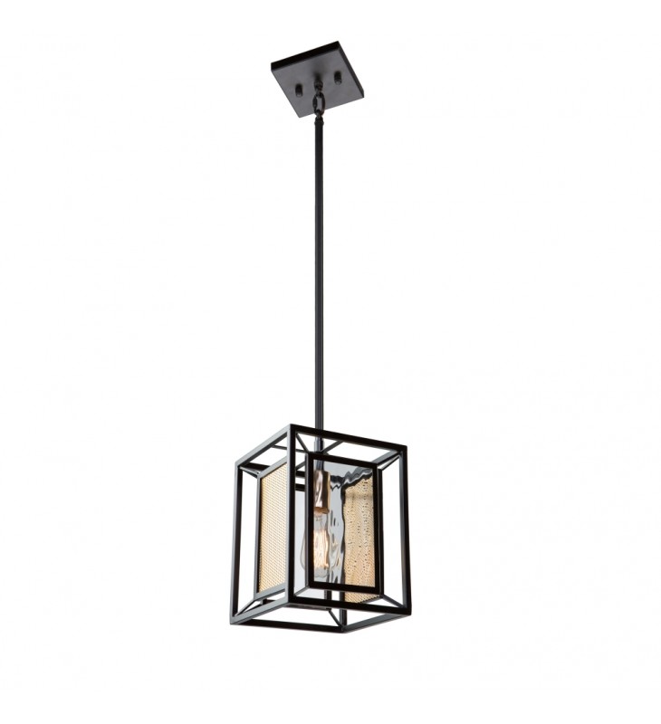 The \"Chadwick Collection\" is unique because of its mixture of colors and elements. Concealing the interiors there is water glass and satin brass mesh. The frame is finish in a dark bronze. These models come with extra rods for height adjustment and hangstraight for sloped ceilings. Very elegant!