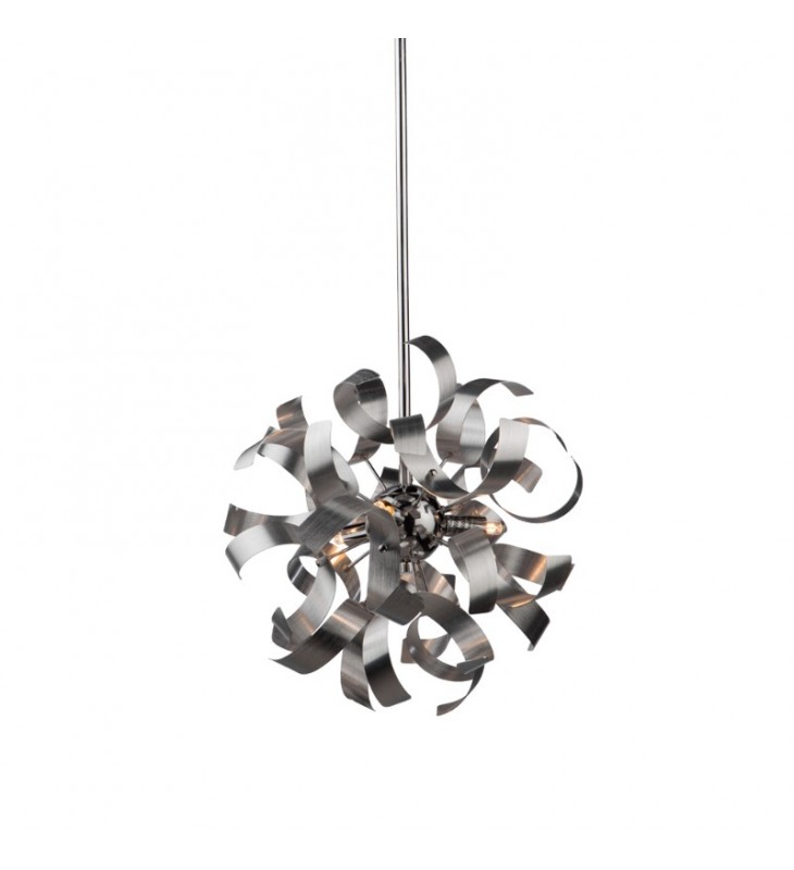 The \"Belair\" Collection is made of fine aluminum twirled leafs suspended to a chrome center frame on chrome stem. The Chrome center help achieve maximum light reflection. Comes with extra rods for height adjustment and hang straight for sloped ceilings. Shown in Brushed Nickel (also available in Black, Copper, and Chrome finishes). (Other sizes available)\nDue to the California Title 20 regulations, replaceable light bulbs will not be included with any product sold to customers in California.\n \n \n \n