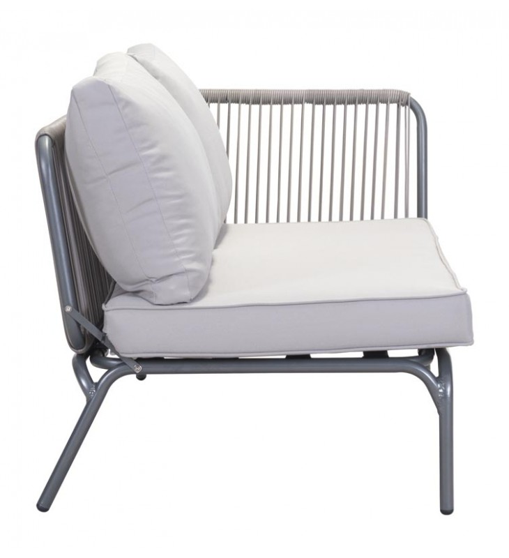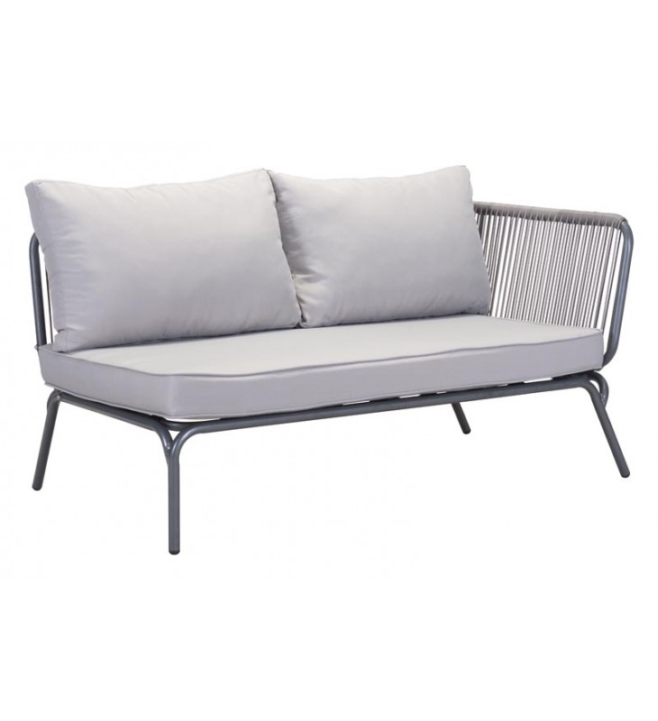 Our laid-back outdoor loveseat, with its arm positioned on the right side, is finished in grey with dimensional grey linear straps for side and back support. Open side on the right can be combined with other pieces in the collection to create a larger seating area or sectional. Cushions are firm for stability, but soft to the touch and comfortable. Built to withstand the elements with its galvanized aluminum frame and weatherproof fabrics, it will look beautiful for years to come. Also available in the collection: armless chair and left-hand facing loveseat.