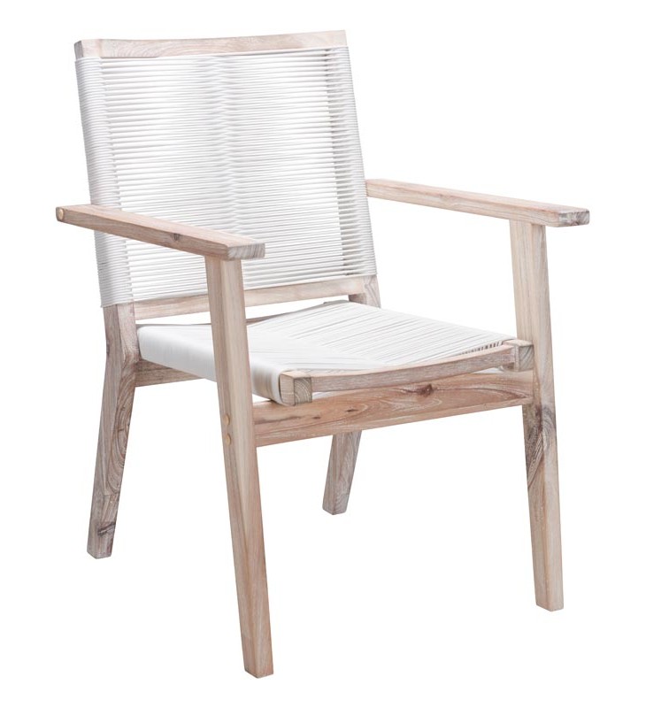 Coastal modern and so chic, this gorgeous outdoor dining chair with armrests, features a comfortable synthetic white weave seat and back with a sturdy white washed solid acacia frame. Pitched perfectly for laid-back dining while still dressed up enough for formal entertaining. Place them around the South Port dining table for a lovely setting.