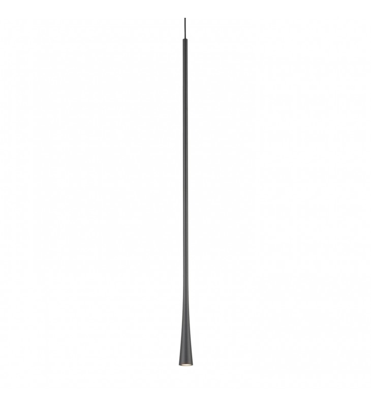 Slightly offset from the suspension cable the die-cast aluminum body repeats linear verticality with an elongated stem that flows into the conical shade. Concealing functionality in an elegant form the X lamp head integrates an LED spot assembly simultaneously serving as heatsink. The exaggerated tubular length provides aesthetic detail while acting as hang straight. Available in several curated finishes.