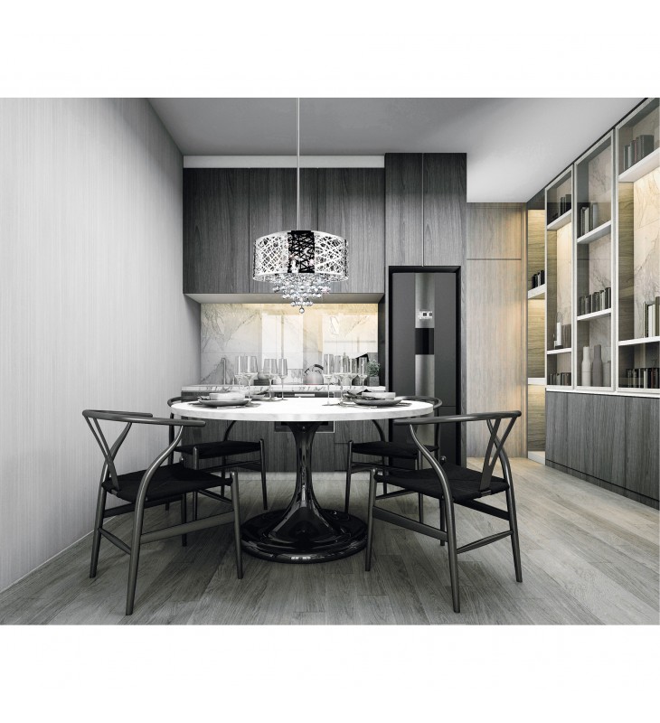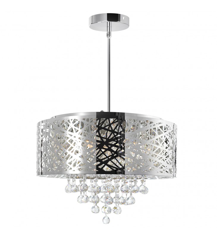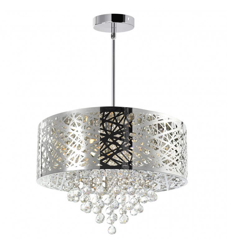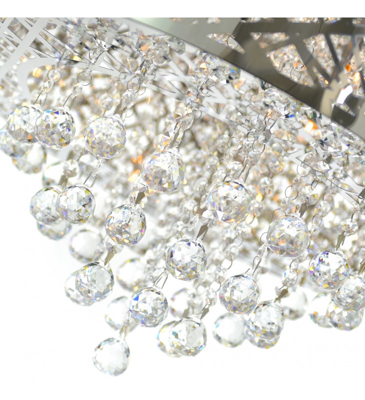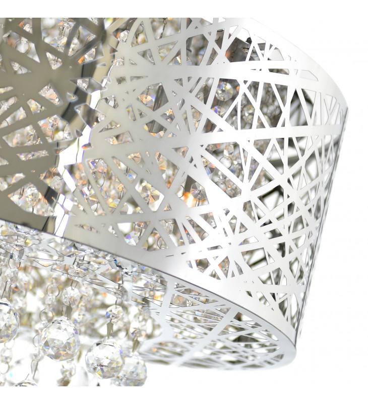 The glittering presentation of the Eternity 9 Light Chandelier makes is the perfect choice to increase the glam factor in a space. This fixture will not just provide your interiors with opulent illumination but it can also take your space\'s ambiance up a notch. Make your bedroom feel bigger or your living room look more luxurious with this textured round drum shade in chrome with cascading strands of crystal beads.