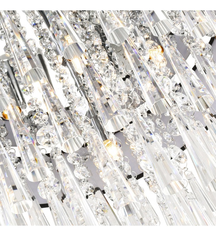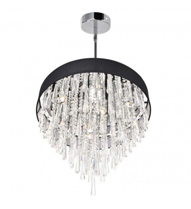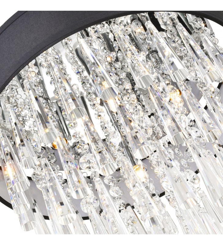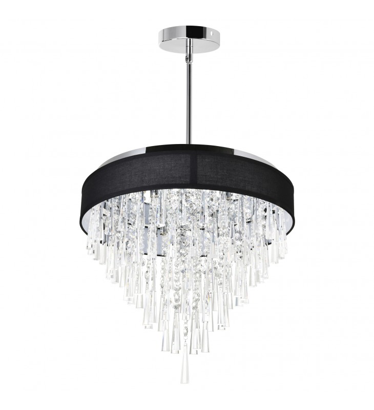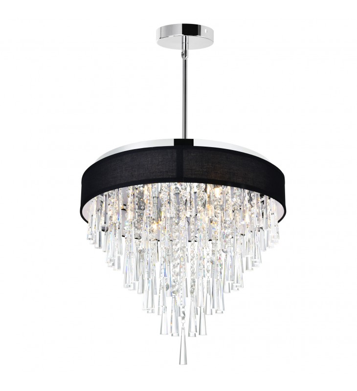Bling it on! The Franca 8 Light Chandelier features clear glass drops that offer undeniable brilliance. Crystal droplets are held in place by a 22 inch drum shade, in off white or black, connected to an adjustable chrome rod with chrome canopy. This large drum shade chandelier is a glamorous choice for modern homes in need of a sparkling update.