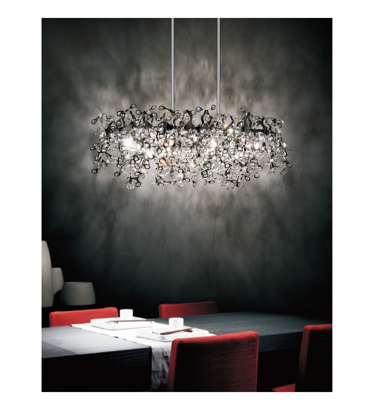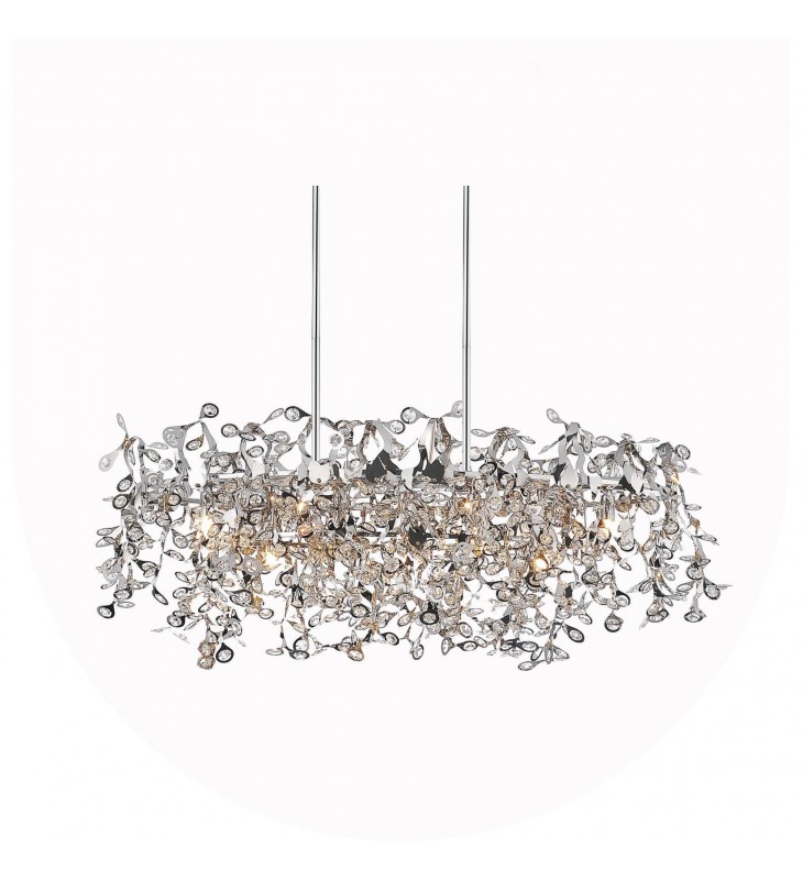 Transform your space with the sheer elegance and exuberance of the Flurry 7 Light Chandelier. This oversized down chandelier measures 37 inches wide and 16 inches tall. It features a circular metal frame surrounded by branching clusters of crystal beads. Seven G9 bulbs from within diffuse light that\'s soft yet bright. This is the funky-elegant finishing touch you need to glam up a space while giving it a playful and cozy vibe.