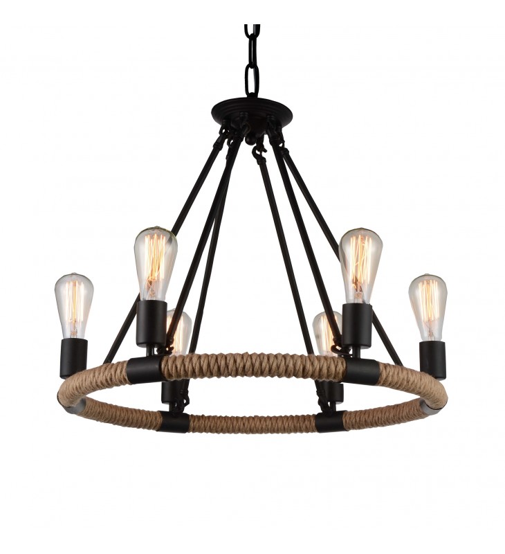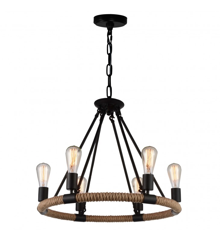 Create an inviting ambiance in your favorite space simply by installing the Ganges 6 Light Chandelier. This light source comes with a 25 inch hemp rope-wrapped circular frame anchored by black metal rods. Six candelabra bulbs provide a warm and even light. Your breakfast nook, farmhouse style kitchen, or cozy dining area could benefit from the gentle glow and the interesting character of this light fixture.