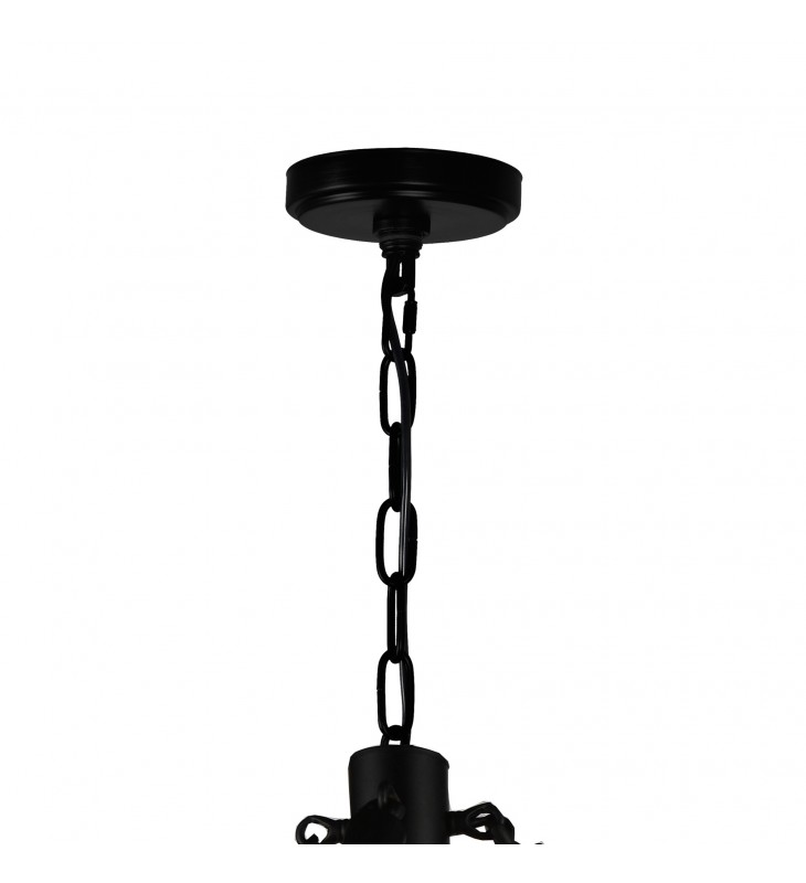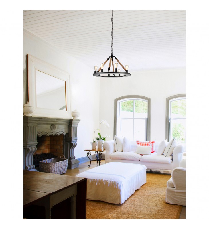 Meant for country chic living, the Ganges 8 Light Chandelier displays the perfect balance of pastoral and refined. This oversized up chandelier features a black circular frame with up-facing bulbs. Securing the wagon-like frame in place are four chains wrapped in ropes for that truly rustic appeal. This light source will make a good impression in the living room, dining room, bedroom, over a kitchen island, or foyer.