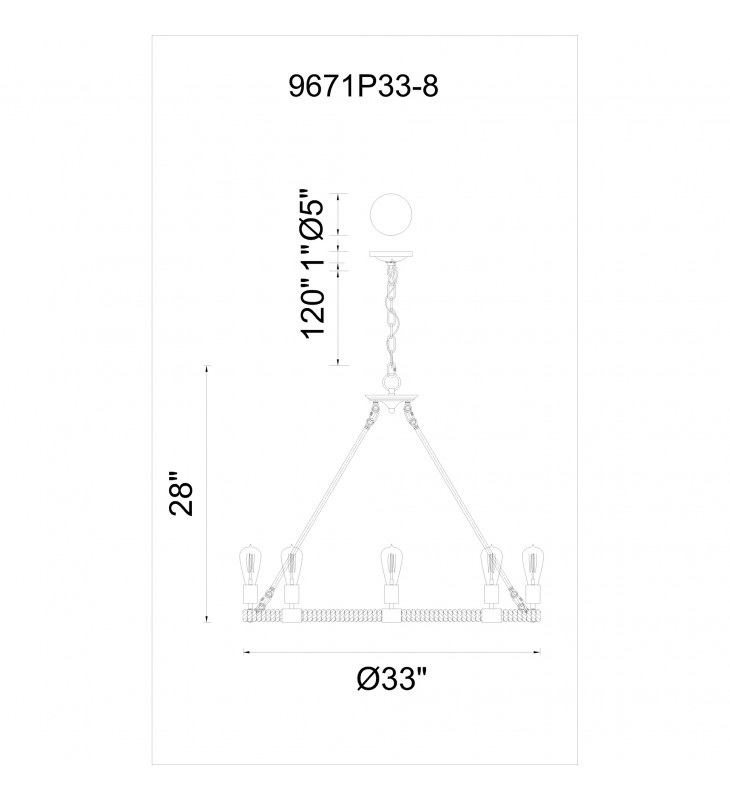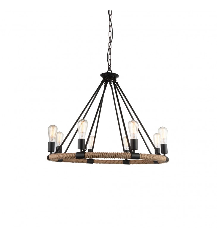 At 33 inch diameter, this oversized up chandelier with a rustic look will bring a lot of personality to your space. The iron frame is complemented by natural hemp rope accents for a look that\'s edgy yet warm. Eight candelabra bulbs will provide even and inviting illumination. This light fixture is compatible with a dimmer for controlled brightness and ambiance.