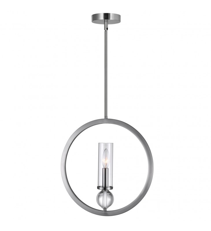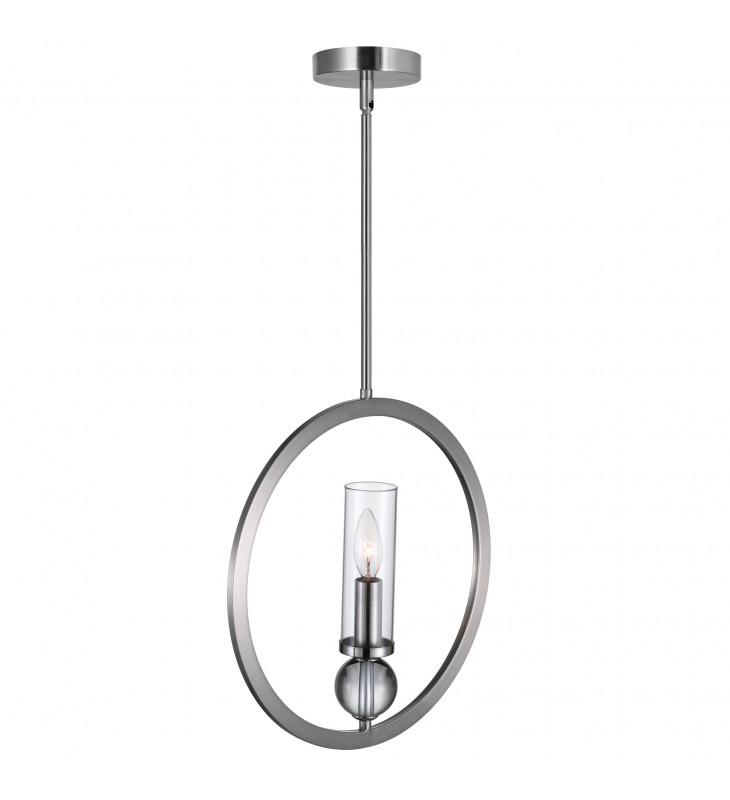 Give character to your minimalist space through this Elton 1 Light Chandelier. Styled with a clean design, this single-bulb pendant light features a 15 inch ring holding one candelabra bulb inside a cylindrical glass shade. The satin nickel finish exhibits that retro-streamlined look that will complement the vintage-y decor in a modern rustic space.