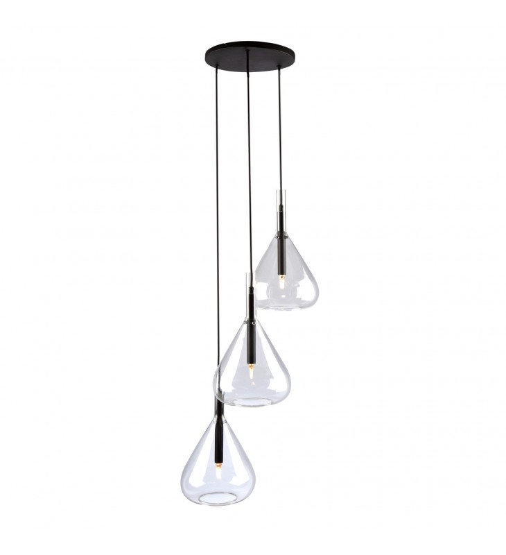 The Conic collection features a uniquely shaped glass design suspended on black frames. The glass is suspended by 3 nickel bullets to give it a floating effect. The bottom of the glass is open for each access to the bulbs. To finish off the design, the wiring has black textile covering.
