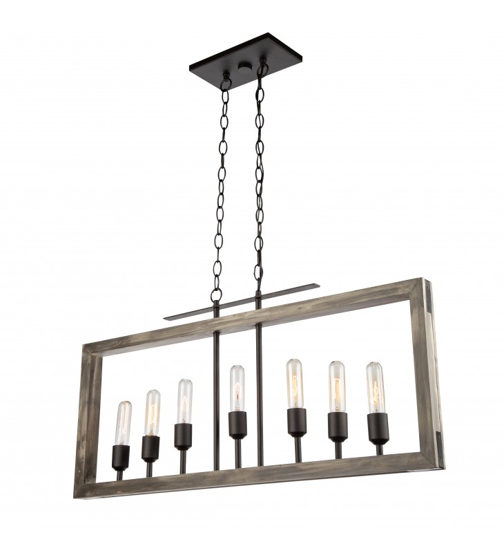Made in North America with pride, this \"Gatehouse\" collection 7 light island linear features a beach wood finish with black metal work. The frame is made of authentic wood (pine).