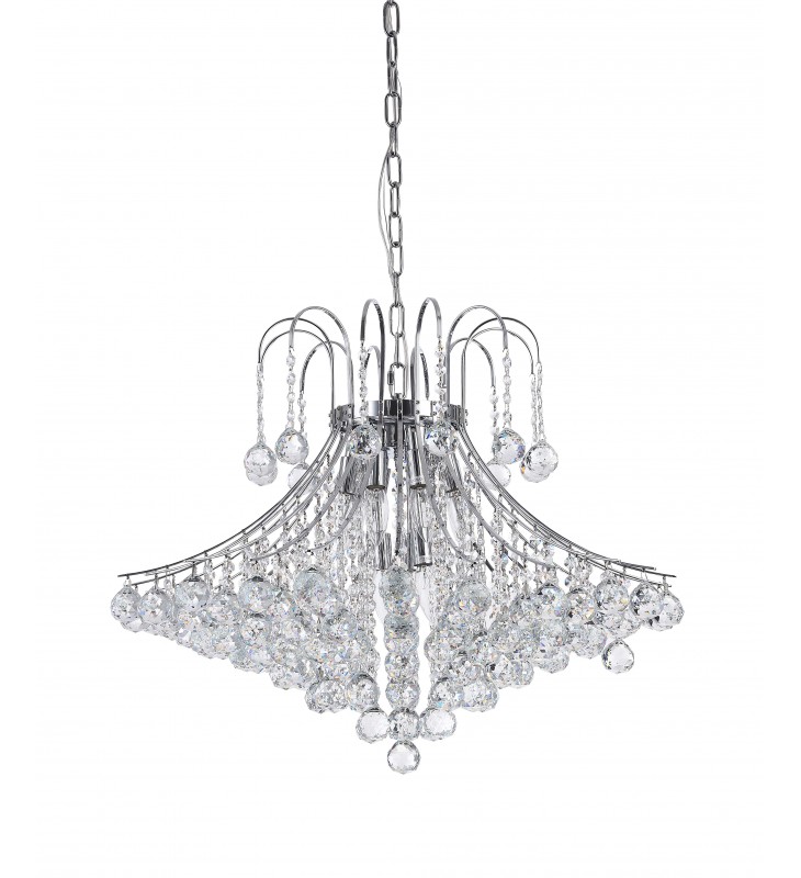 This exquisite chandelier is in a chrome finish. The frame of this chandelier is made out of iron, and it comes with clear crystal drop balls, adding even more modern.