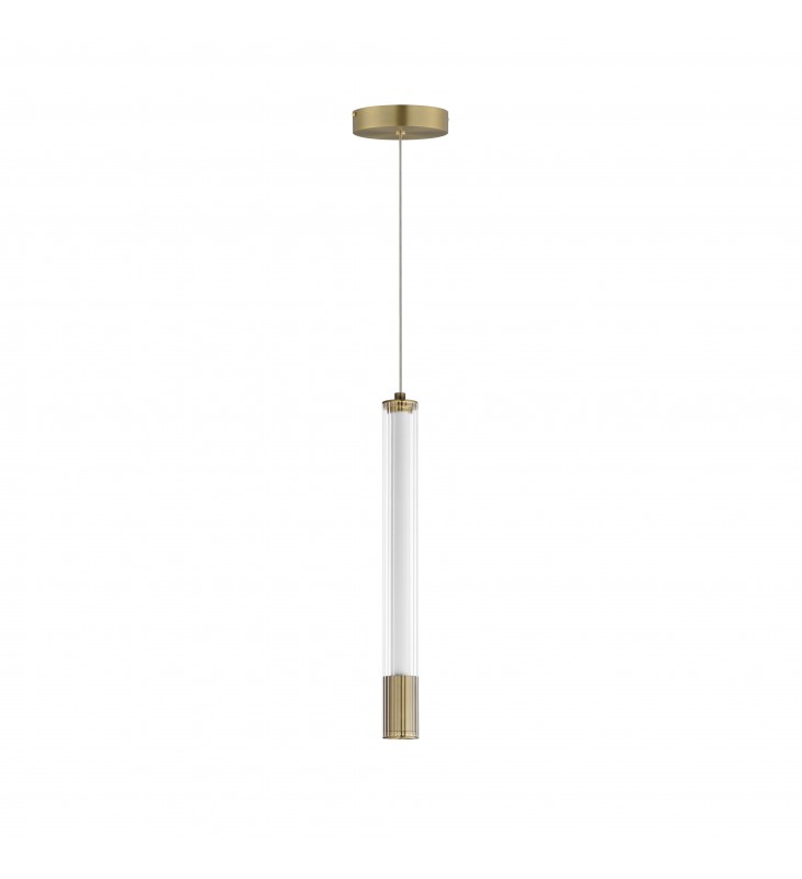 A central, cylinder diffuser of opal white acrylic diffuses LED lighting within a cavity of thin ribbed glass of various lengths. Both imaginative and functional, the bright pendants encase an additional down light recessed within a Polished Chrome, Naturally Aged Brass or Matte Black housing casting light downward.