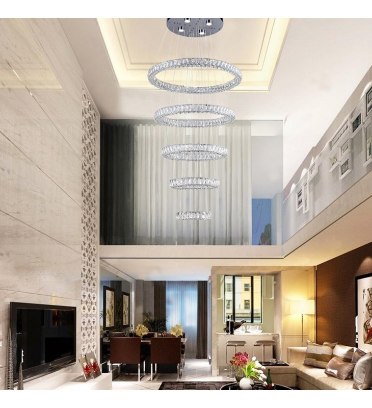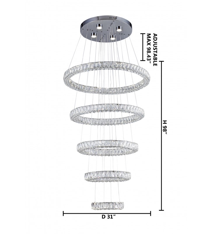 It is an extremely exquisite LED light fixture. This fixture contains five tiers, and all of them is in a chrome finish with round clear crystal covered. You can create a timeless feel in modern forms