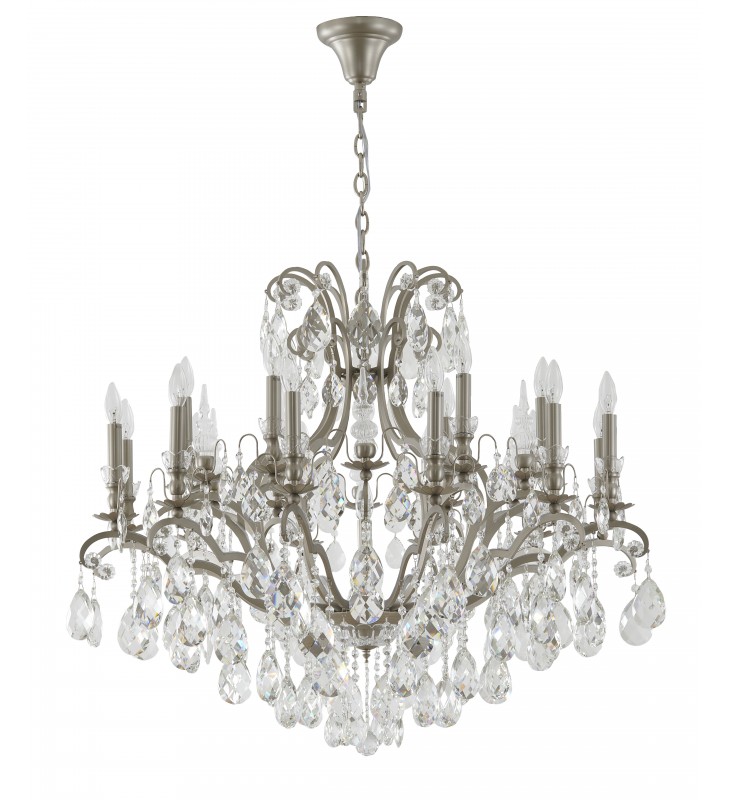 This modern chandelier is in a pewter finish. Nineteen E12 bulbs (sold separately) can provide better illumination. Clear crystal adornments make the fixture more exquisite.