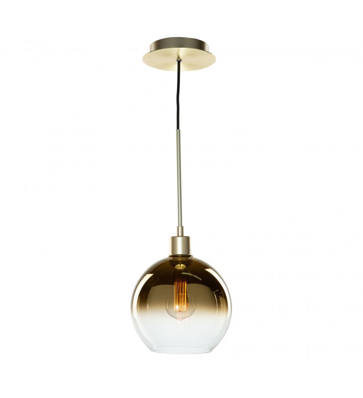 From designer Steven Sabados [S&C], the \"Morning Mist Collection\" is an instant classic. The glassware is so unique in that the bottom is clear but as you reach the top part of the sphere it is plated with a gold semi transparent mirror. The frame is finished in a matte brass. The black wires are all height adjustable. This series has multiple configurations. Model shown is the single pendant.