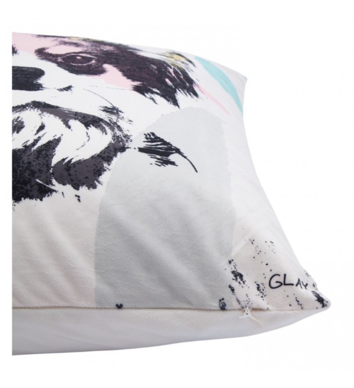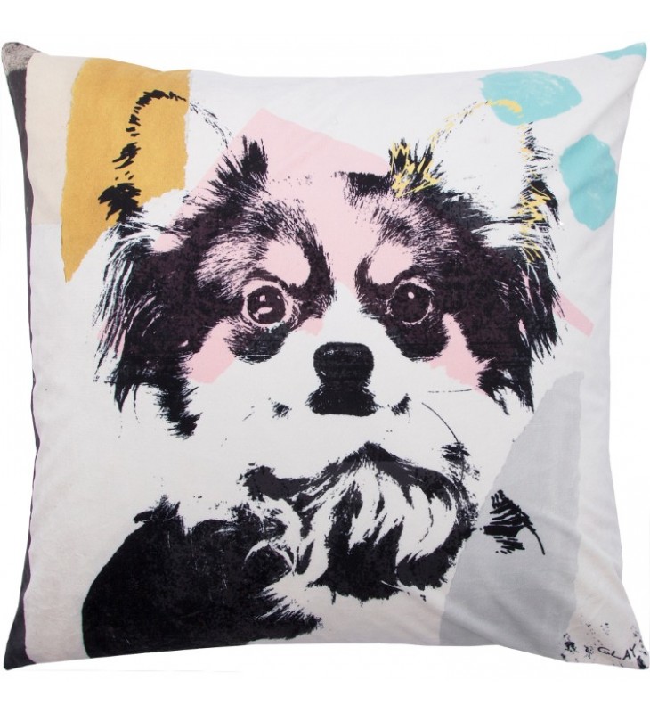 Compose a chic pillowscape on couches and beds with the modern style of this decorative pillow. Printed in graphic detail on a square pillowcase, Scandinavian-inspired shades of sky blue, pink and yellow splash across a playful dog portrait in a fun design that turns an ordinary cushion into a captivating work of art. A sumptuous combination of duck feathers and down fill the standard pillow sham with enduring softness, offering comfortable cushioning for every seating or sleeping arrangement.