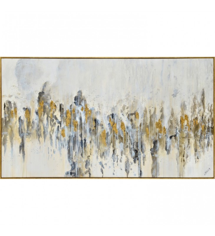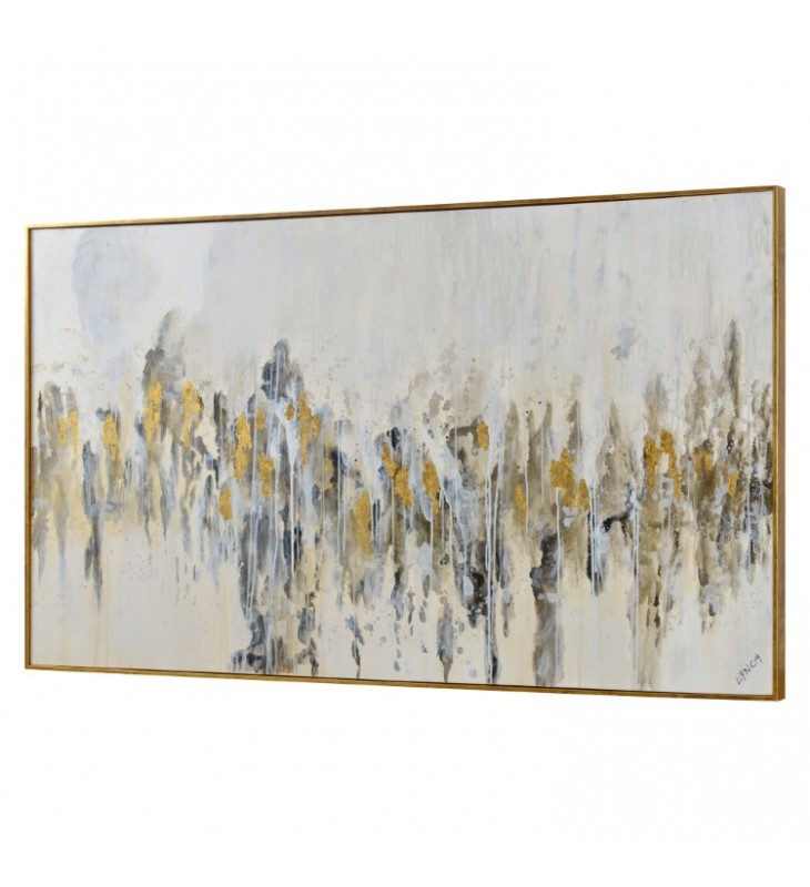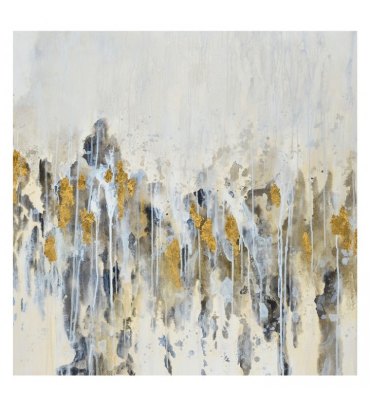 Gold leaf accents create compelling textures in this abstract painting on canvas. Cascading shades of white, black and smoky gray form an enchanting fissure as they travel across the horizontal foreground. Eye catching inside an antique gold frame, this modern art piece looks glamorous above a fireplace or feature wall.