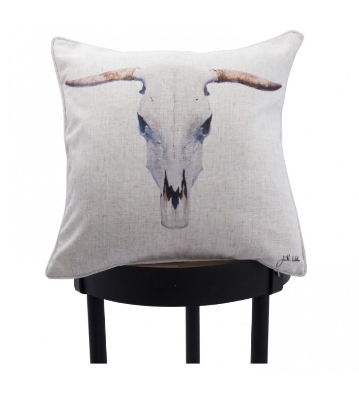 Compose a chic pillowscape on couches and beds with the traditional style of this decorative pillow. Printed in graphic detail on a square pillowcase, shades of white and brown capture the bare bones of the animal skull and horns with a rustic design that turns an ordinary cushion into a captivating work of art. A sumptuous combination of duck feathers and down fill the standard pillow sham with enduring softness, offering comfortable cushioning for every seating or sleeping arrangement.