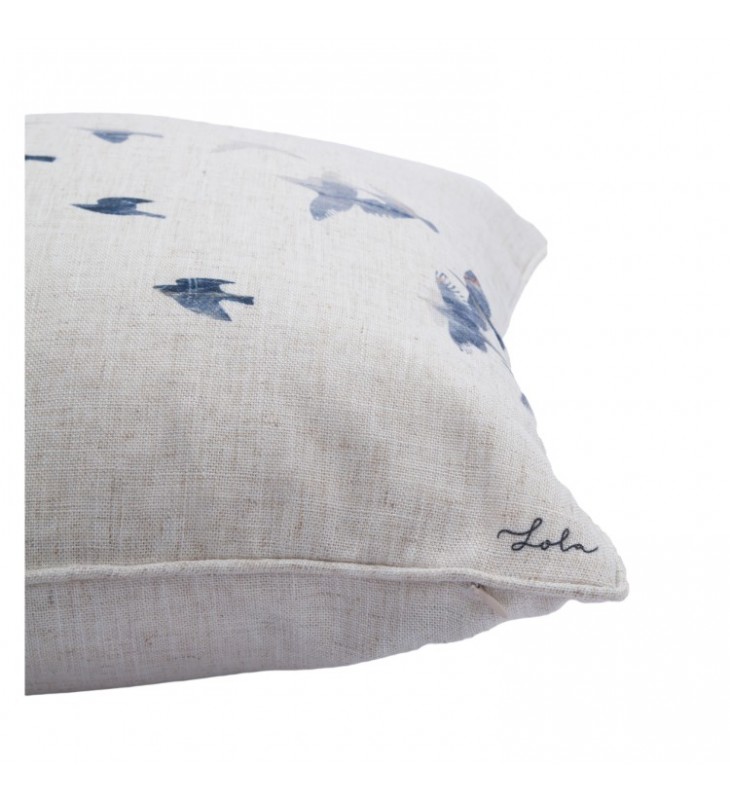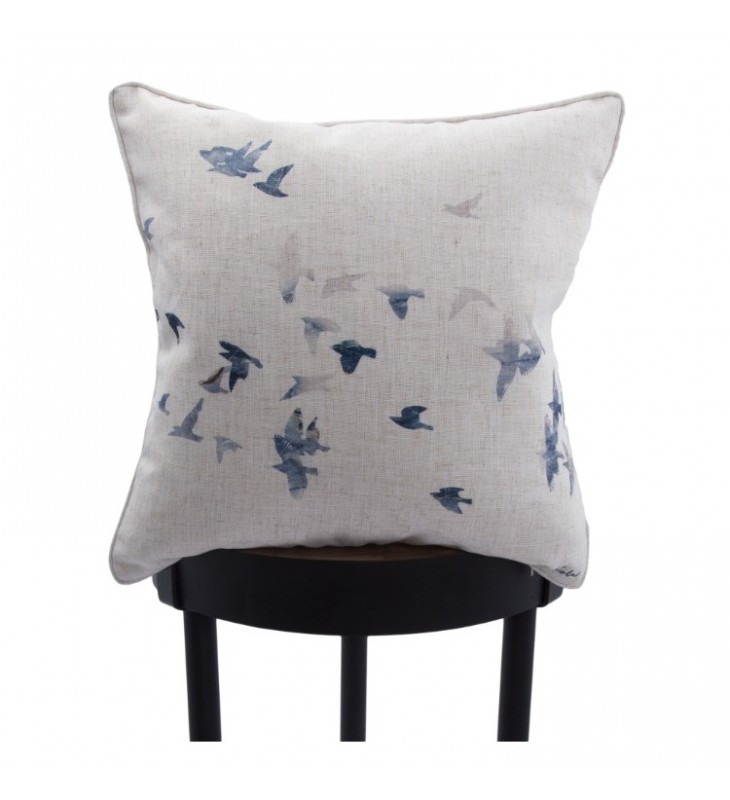 Compose a chic pillowscape on couches and beds with the traditional style of this decorative pillow. Printed in graphic detail on a square pillowcase, blue silhouettes of a flying flock of birds cross the off-white background in a charming design that turns an ordinary cushion into a captivating work of art. A sumptuous combination of duck feathers and down fill the standard pillow sham with enduring softness, offering comfortable cushioning for every seating or sleeping arrangement.
