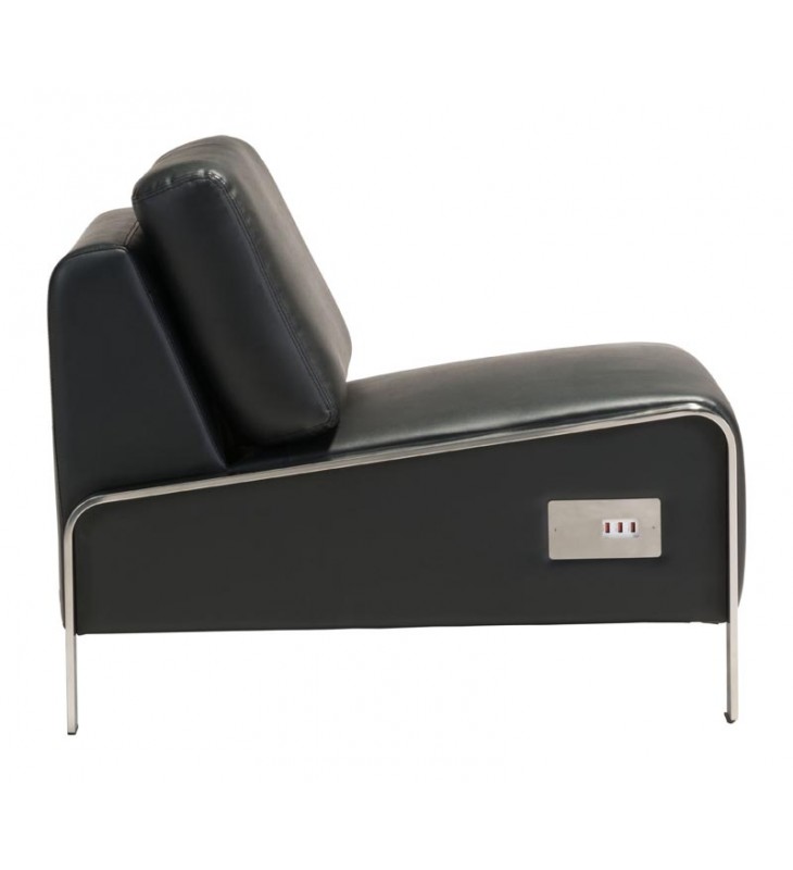 Stylish and functional, the Thor Armless chair features a modern design with smooth leatherette fabric on sleek profile and accented with slim chrome frame. USB panels on each outside base are added for easy access in charging electronics. Each port houses three USB ports for all your charging needs. Perfect for events, public spaces or anyone who appreciates the ease of charging their electronics why relaxing in style. Color options include black and white leatherette for both arm chair, sofa and ottoman.