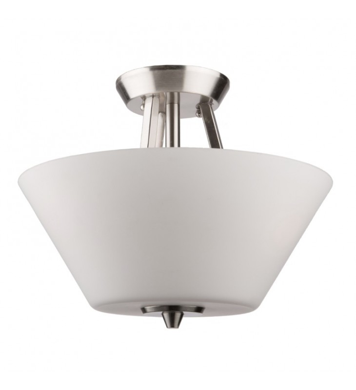 Plated in a rich brushed nickel finish, complimented by frosted white glassware, the 3 light semi flush mount from the \"Clayton\" collection is clean and precise. \n \n \n \n