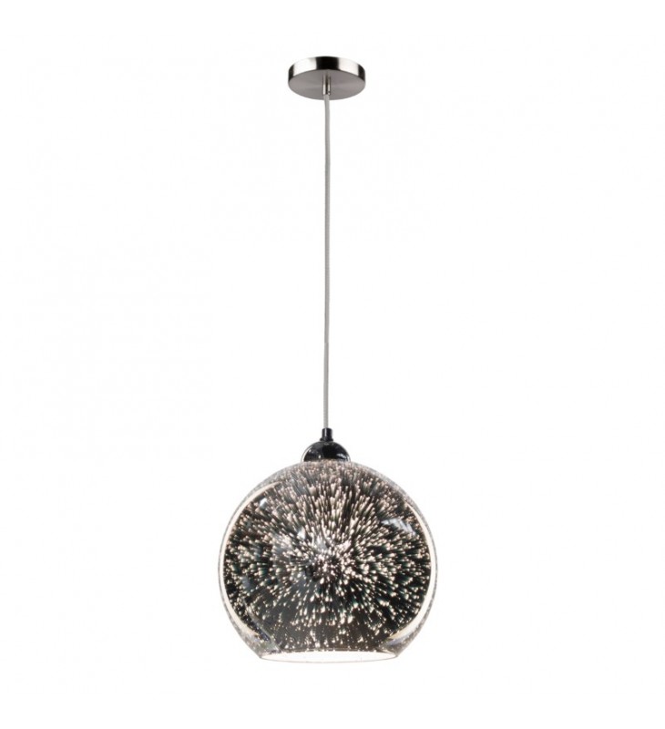 This pendant from the \"Lux\"collection is truly unique. When the light is off, it looks like a reflective mirror with bubbles in it. However, when you hit the switch and turn on the light, the pendant because translucent and those \"bubbles\" in the glass look like three dimensional stars. Suspended on its wire with a cloth cover - which is adjustable. Canopy is brushed nickel.\n \n \n \n
