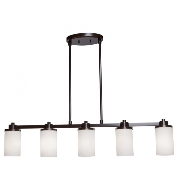 Parkdale 5 lite down island features its clean and simple design complimented with opal white glassware in rubbed oiled bronze finish (2 x 18\" & 2 x 12\" & 1 x 6\" rods included with hang straights)\n