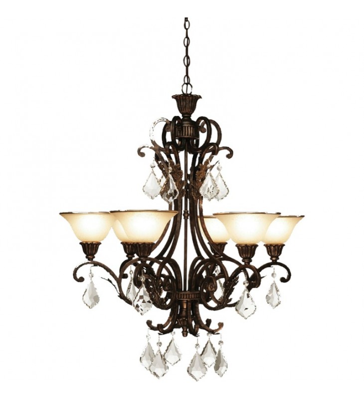 Florence 6 lite Chandelier carefully decorated with caramelized glassware that has a hand applied gold trim, and various shades of bronze finishing complimented with sparkling crystal (Also compatible with Energy Efficient screw type compact fluorescent bulbs)\n