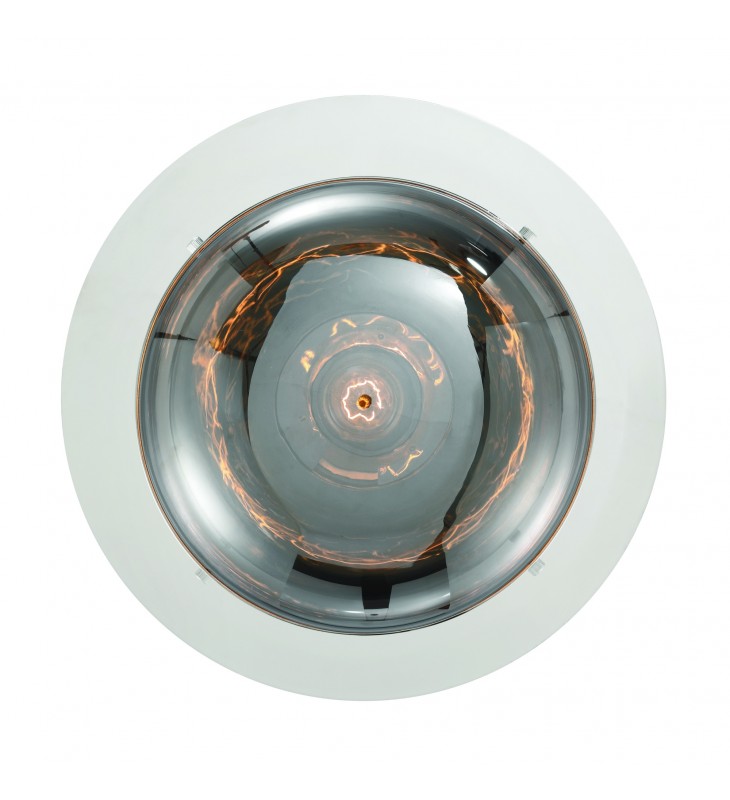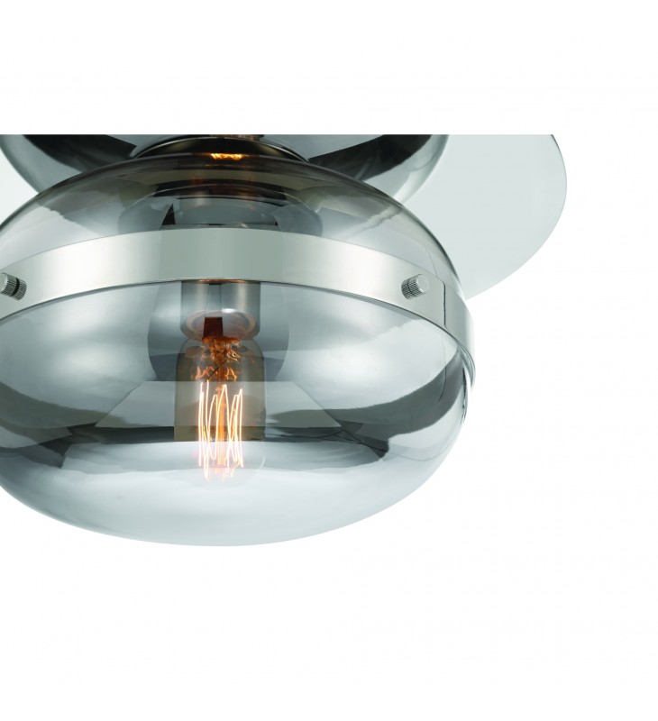 A band encircles each glass orb that beautifully reflects a warm glow from the vintage lights within. The metal support creates an inviting counterpoint to the austere design
