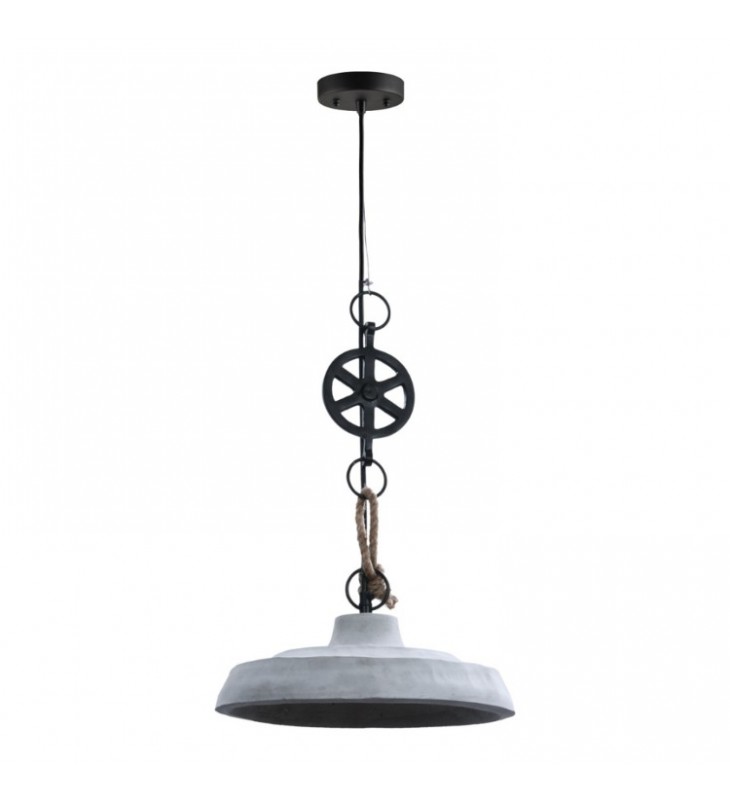 From the dockside to the dining room, this modern ceiling pendant light emphasizes the elements of industrial design. The light grey concrete lampshade is suspended by a fixed rope and pulley system. The vintage appeal of the light fixture is perfect for those with an appreciation for reclaimed architectural elements.
