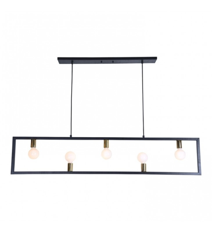 Light up a darkened dining room table with the ladder-rung design of this modern rectangular ceiling pendant. Exposed lightbulbs are mounted to a matte black metal frame, filling the open center of the horizontal light fixture with warm illumination. Each bulb is wrapped in gold-plated metal for a touch of glamour, conjuring the look of vintage marquis lights surrounding a dressing room vanity mirror.