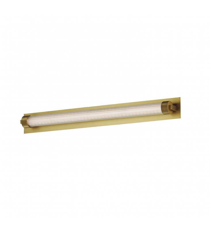 Clear ribbed glass encases a tube of opal white acrylic evenly illuminated by LED. The ends of the glass shade are fitted with knurled cylinder forms that suspend the sconces from their mounting plates. Dual mounted options are available for this series allowing it to be installed on single gang junction boxes. Available in Natural Aged Brass, Polished Chrome, or Matte Black finishes.