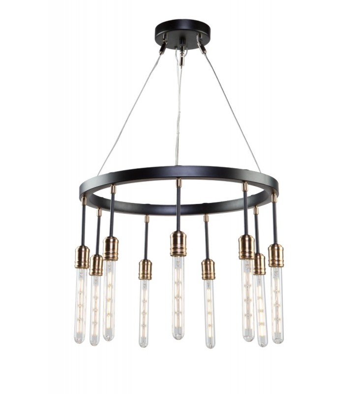The \"Willow Collection\" features a very trendy design which is finished in dark bronze with vintage brass accents. The frame is suspended by thin aircraft type cable which is easily adjustable for different heights. The willow looks amazing with these long narrow T9 bulbs. (however any medium base bulb would fit)