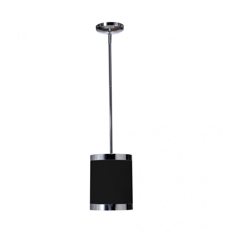 Beautiful tuxedo black shade trimmed with chrome banding on a smooth chrome frame (Single lite rod pendant)\n \n \n \n