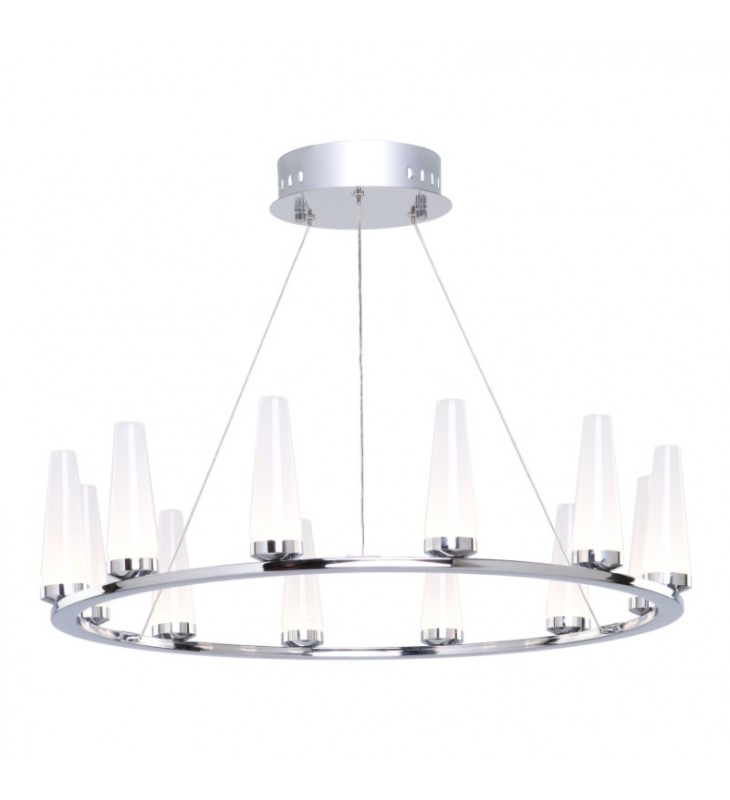 Suspended by ultra thin cable, plated in chrome and illuminated by LEDs, the \"Briar Collection\" is precise and well executed in design. The LED light source radiates through the shiny white mini cone shaped glassware. Many sizes available. (The push pin design on the canopy makes it easy for different height adjustments).