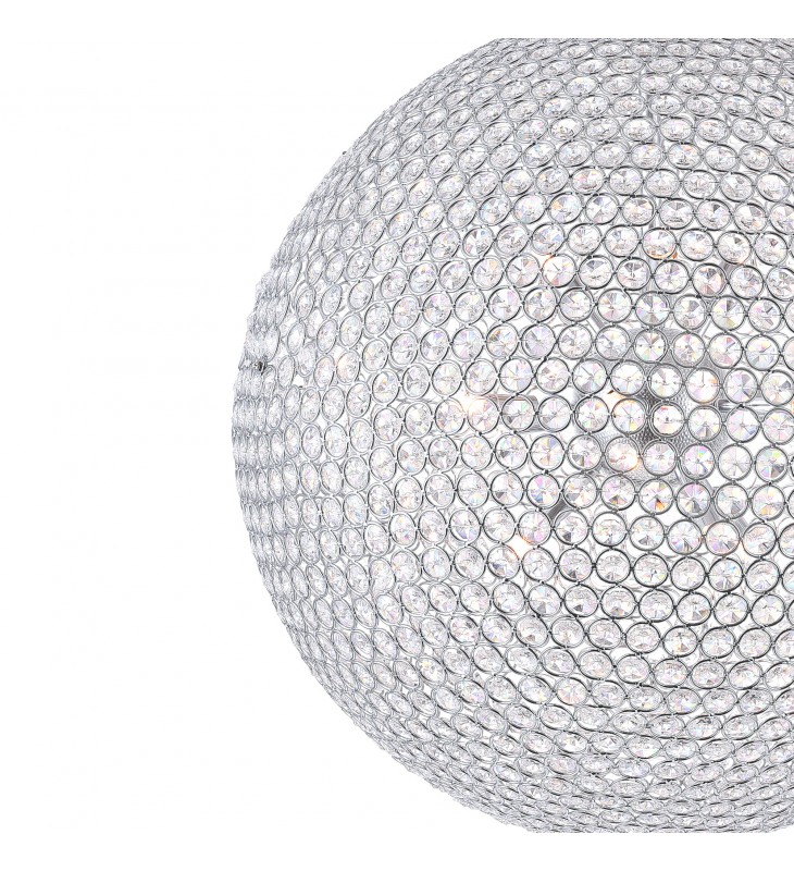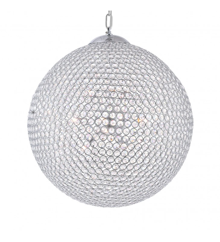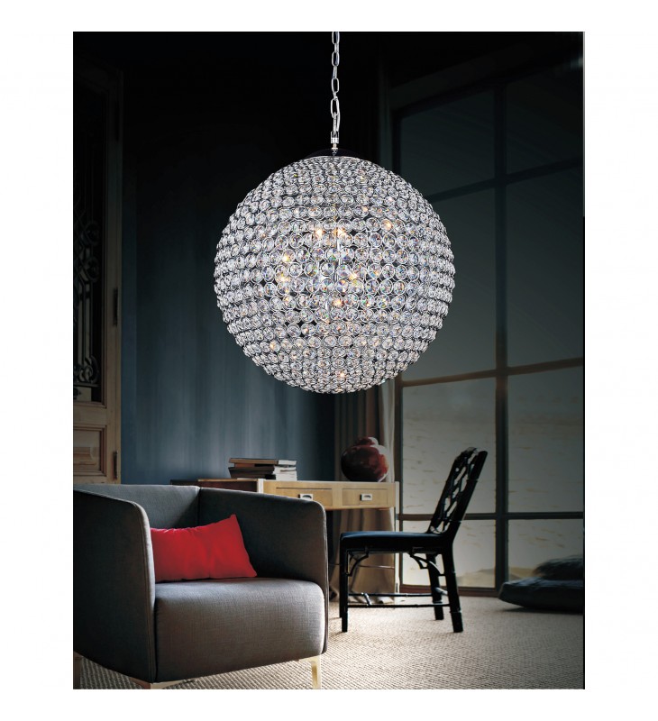 The Globe 26 Light Chandelier is a twinkly ball of light ready to add shine and glamour to your interiors. This oversized \"disco ball\" chandelier measures 40 inches in diameter and has a sparkle that\'s simple yet elegant. Twenty-six bulbs are concealed inside the chrome-finished globular shade. Use this with a dimmer and be able to control the brightness and the ambiance.