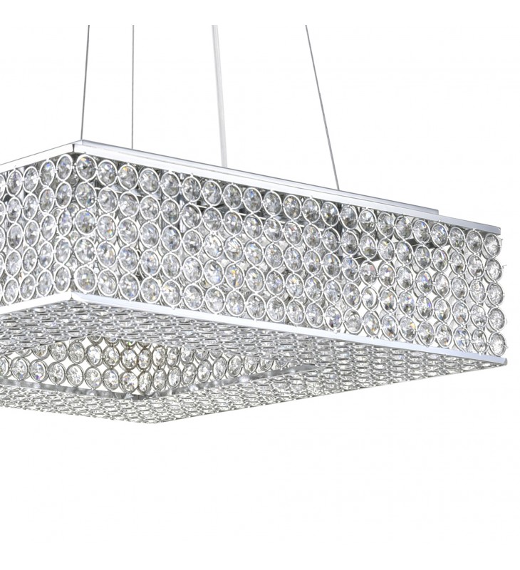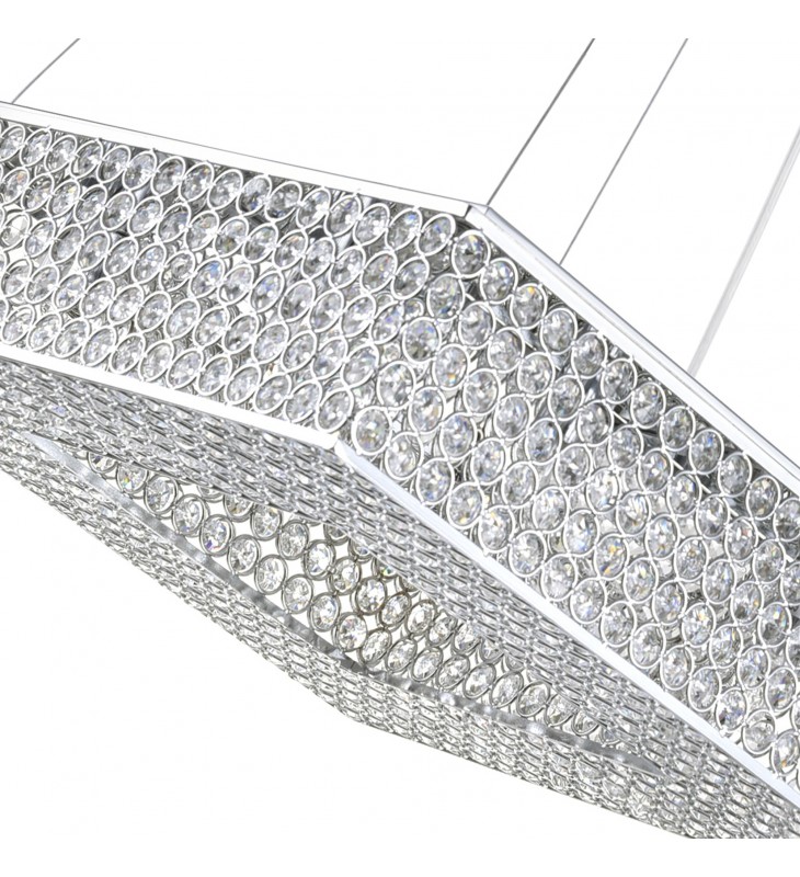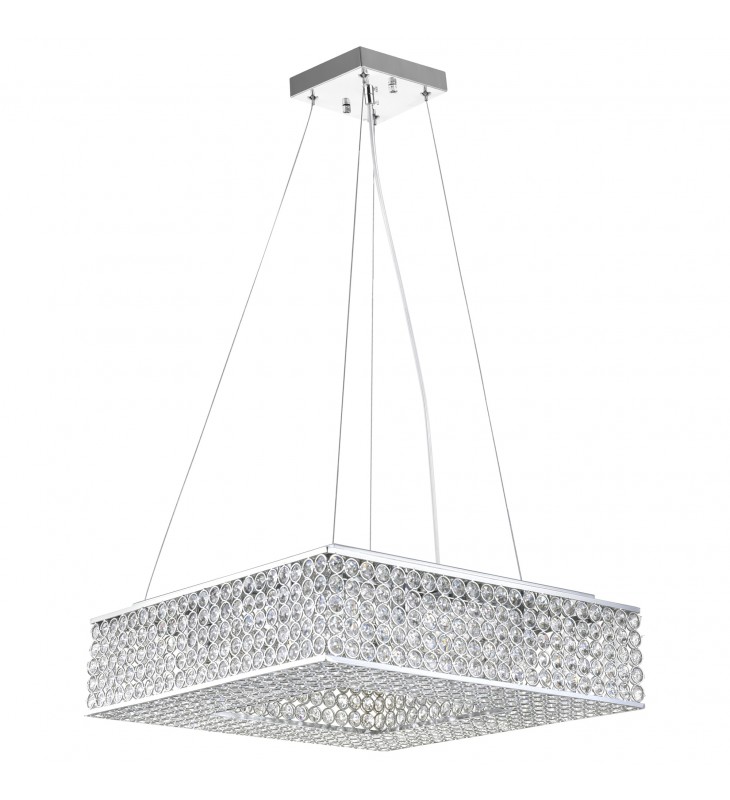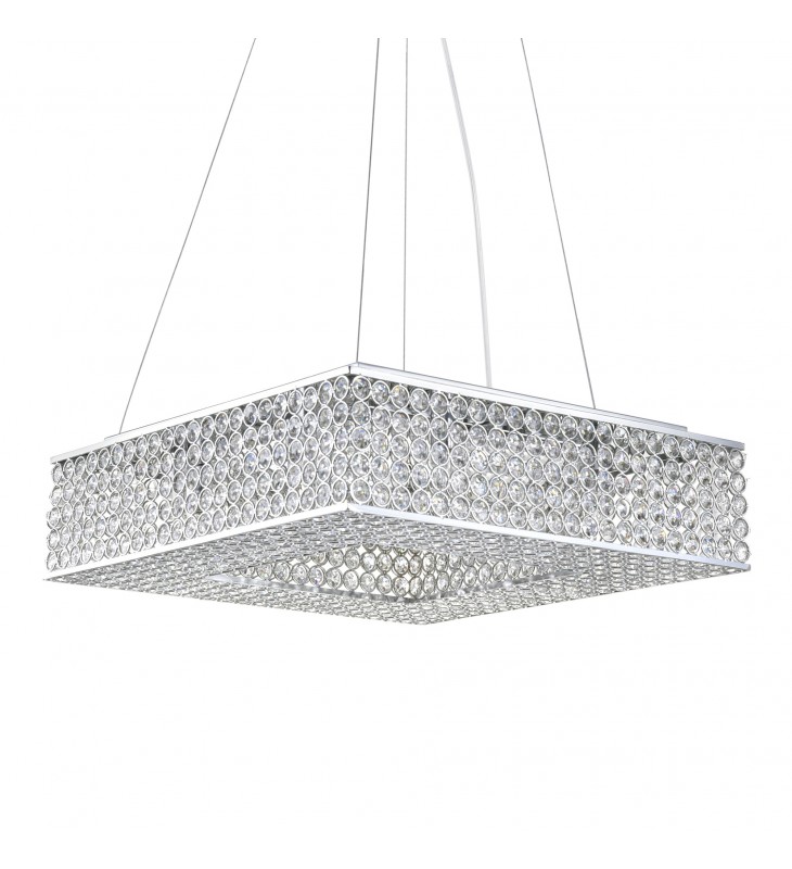 This Dannie 8 Light Pendant is a chrome-finished chandelier with a high-profile look. It features a 14 inches wide square pendant with lattice patterned panels and chrome-finished metal edges. Covering the top, bottom, and side panels are clear crystals that cast a twinkling glow. The glittering finish of this chandelier is perfect for when you want to give your space a sense of modern opulence.