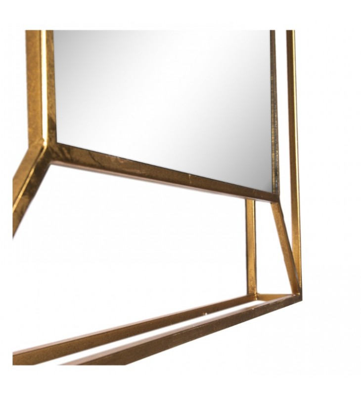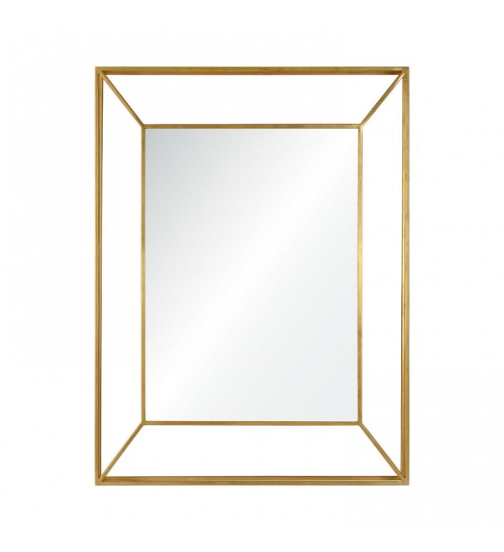 Traditional gallery style gets an ultramodern update in the iron framework of this rectangular wall mirror. The smooth looking glass is suspended between artfully welded bars of metal for a fresh take on classic wood molding. A gold finish and floating frame format sets this mirror apart from the rest of room.
