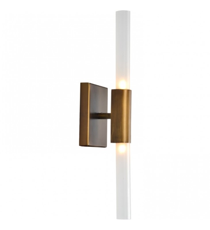 Sleek and sophisticated, the modern silhouette of this decorative wall sconce adds artful illumination to interior walls throughout the home. Mounted vertically or horizontally, the square base of the sconce holds a tubular baton of translucent glass that captures the glow of two LED bulbs within. The iron base is plated with a brushed bronze finish that gives the glamorous light fixture a gorgeous patina. LED bulbs included.