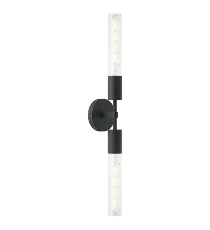 The Lumie?re is a modern wall vanity in an Aged Gold Brass or Matte Black socket and round backplate complemented by ribbed glass. Available in single or 2 light.