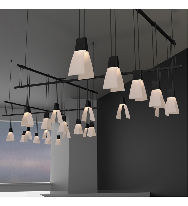 Wings soars on the subtle curves of its featherlight sheer profile, shielding and revealing the luminance from within. Viewed from its face, the delicately-flared wings radiate illumination through their gossamerlike surface. Seen in profile, the wings open on edge revealing the LED source and its reflection. In the Zig Zag Suspenders configuration shown here, both views of the Wings are shown in aligned segments