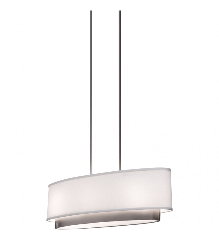 Scandia Oval Chandelier featuring a linen white shade with a brushed nickel inner trim that peaks out the bottom enclosed by a acid white glass diffuser\n \n \n \n