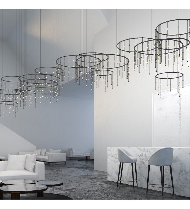 Suspenders Offset Ring System offers the ability to build a virtually limitless range of patterns and configurations of varying heights and widths. Shown here with Ladder Lights on Hangers of various lengths and Rings of various diameters, this spectacular, delicately-scaled Horizontal Matrix configuration expands its offset pattern across the expanse of the ceiling plane.