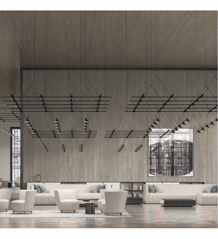 A series of Gridscape configurations are suspended from the apexes of triangular Truss Hangers, providing precise locations for the ceiling mounted supporting cables. V-line Downlight Cone Luminaires are suspended in perfect alignment to the Truss forms along the grid, establishing a rhythm and cadence of alignment along a centerline of the trusses and the cord-suspended Luminaires.