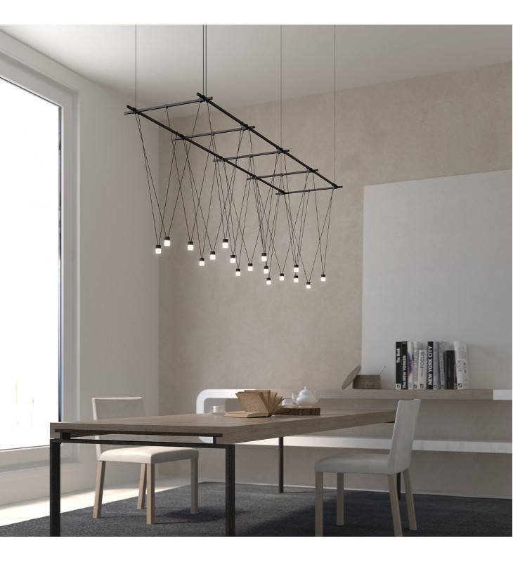 Power Bars form a linear planar Gridscape, which can be constructed in a variety of overall sizes and cellular scales. Any of dozens of Luminaire options can be fixed to or suspended from any position along the intersecting Power Bars. Here, etched glass V-Line Cylinders are suspended in a crossover pattern along the open planar grid.