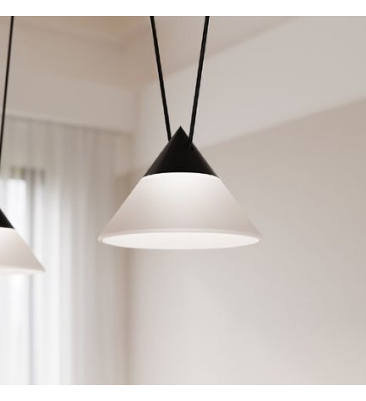 Etched white glass cones are suspended from dual round cords spread in a rhythm of intersecting patterns along a Power Bar.