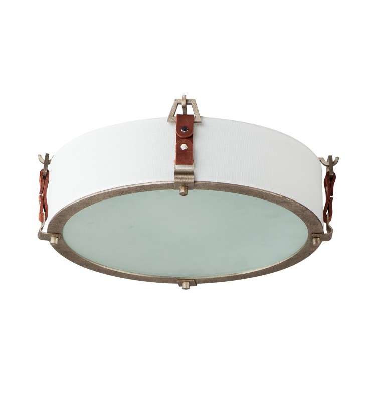 Inspired by the artist enclave north of San Francisco, pastoral elements influence this series of drum shades. Stirrup-like hooks support genuine suede straps in a Tobacco Brown finish which in turn suspend drum shades in an Off-white linen fabric. Metalwork in a hand-applied Weathered Zinc finish frame the frosted glass diffuser at the bottom to softly diffuse the lighting within. Head out West with this rustic, yet refined design.